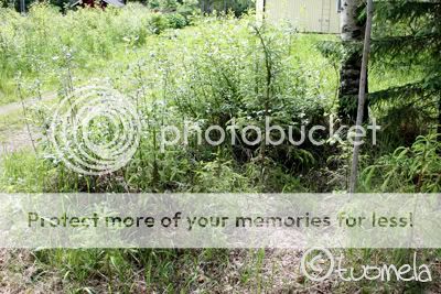 Muistinpa vihdoin kuvata meidän pikkuruisen keskeneräisen kuusiaitammekin, josta en ole enää ollenkaan varma, että se oli hyvä ajatus. Nyt kun ympärillä on tarpeeksi (lue: liikaa) entisiäkin ötökkäpuita (hyttysethän elelevät  juuri nimenomaan kuusissa), niin ehkä ei olisi tarpeen niitä enää lisää istutella. Kuvassa on vielä sellaisiakin kuusia ja muita taimia, jotka nyhdetään irti maasta, kunhan ehditään.