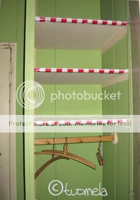 Kun huone oli siivottu, oli tietysti myös pikkuinen komero puunattu sellaiseen kuntoon, että sinne saattoi asetella vaatevarastonsa ja liinavaatteet sekä pyyhkeet. Ensin kuitenkin tehtiin perinteinen hyllyjen paperointi. Myös vanhat puuhenkarit olivat itsestään selvä valinta.