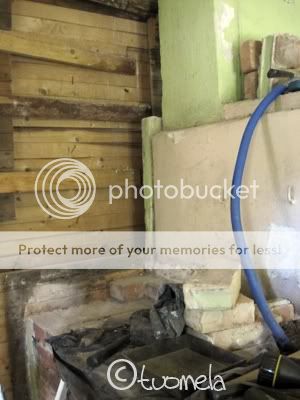 Tässä valmistuu jo kovaa vauhtia uutta seinäosuutta. Sitä ennen oli avattu pala lattiaa ja tehty anturi hellan "helman" jatkeeksi. Sen on tarkoitus omalta osaltaan kantaa myös uutta tiiliseinää.