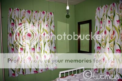 Ikkunan puitteet saavat myös käsittelyn niin sisäpuolelta kuin ulkoakin. Kamarin ikkunat oli tarkoitus jo nyt hioa vanhoista maaleista ja maalata uudelleen, mutta lopulta siihen ei jäänyt tarpeeksi aikaa. Sama tehdään myös kamarin ovelle sitten aikanaan. Ulkoapäinkin näytti jo huomattavasti kotoisemmalta, kun verhot oli saatu ikkunaan.